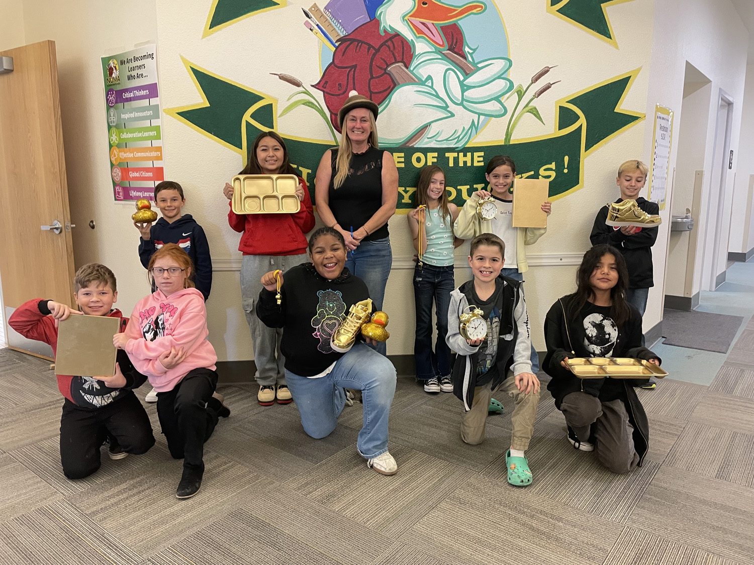 At Numa, students and staff are recognized each month for demonstrating SOAR expectations across the school. Classes earn special “Golden Awards” for excellence in areas like behavior, teamwork, and responsibility. Staff members are also recognized with Golden Awards for outstanding teamwork and innovative ideas, making it a fun way to celebrate the efforts of the whole school community. Library winners include Lisa Fritz and Vickie Purrell’s classes, who earned the Golden Book for SOAR behavior in the library; Colleen Tutty and Barb Hickox’s classes, who won the Golden Sneaker for SOAR behavior and sportsmanship in PE; Jerrilynn Nall and Lacey Kerr’s classes, who received the Golden Lunch Tray for SOAR behavior in the cafeteria; and Heidi Emke and Purrell’s classes, who were awarded the Golden Clock for excellent attendance. On the playground, Tutty and Ken Brouse’s classes earned the Golden Whistle for lining up with SOAR behavior, while Tutty and Leslie Brown’s classes won the Golden Duck for perseverance during a field trip. Gayle Webb, Numa’s office manager, was recognized with the Golden Lightbulb for her many great ideas. Picture below: Numa - Office Manager Gayle Webb joins students from each of the winning classes as they show off their Golden Awards.
