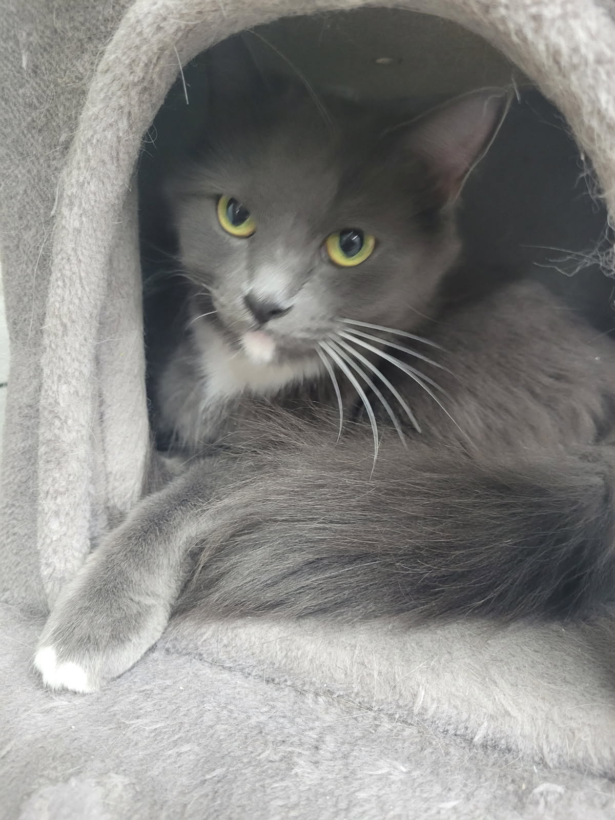 Freya is a stunning grey beauty with a charming tuft of white on her chin and chest. She’s as sweet as she is cuddly, with a gentle personality that wins hearts instantly. Freya is hoping that someone will see her photo, fall in love, and hurry over to FAWG to make her part of their family.