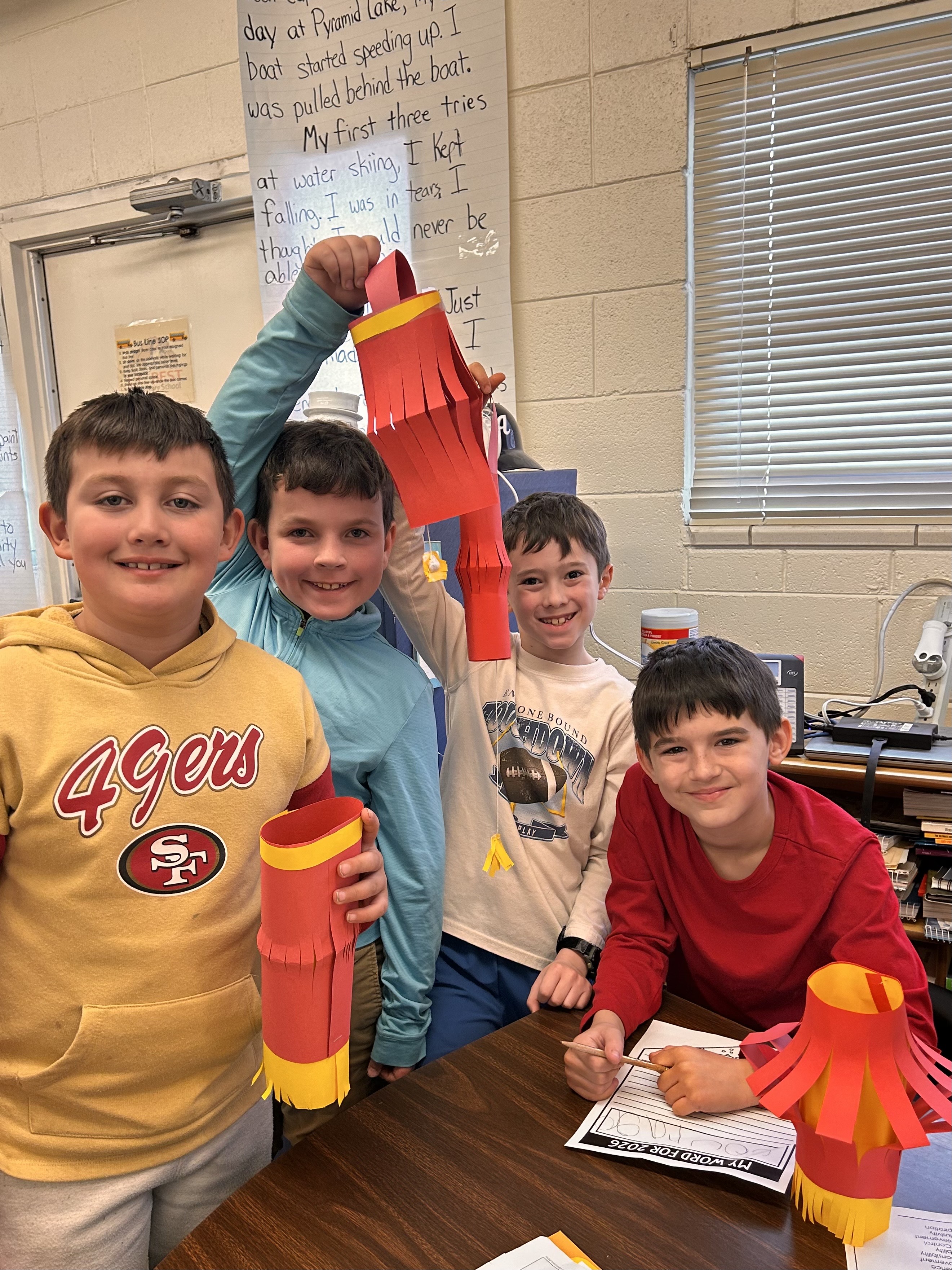 Students in Angie Heck’s class explored traditions from around the world by comparing and contrasting the American New Year with the Chinese New Year. As part of the lesson, students created Chinese lanterns and reflected on the year ahead. Each student chose one word to describe their 2026, sharing hopes for a new year filled with love, hope, faith, creativity, curiosity, and adventure. Photo: Manuel Bettencourt, Easton Muckey, Kyle Roxo, and Caden Thomas showoff the Chinese lanterns they made during a lesson on New Year traditions.