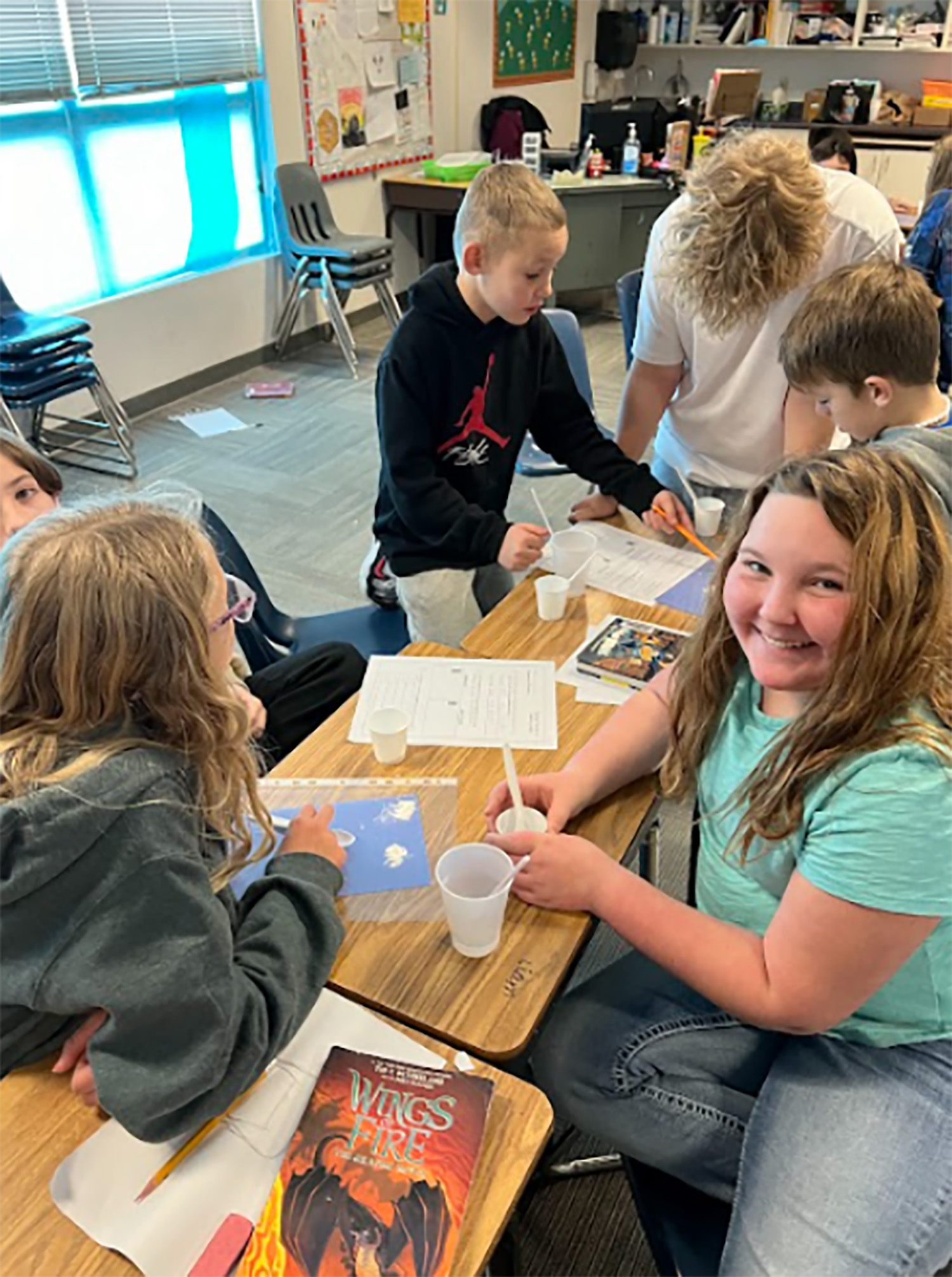 Photo: Raegan Amerine, Liam Wright, Burrell Wood, Eli Lavy, Lyncoln Ritz, and Kol Muckey observe chemical reactions during a classroom experiment led by Aspen Johnson at Numa Elementary School.