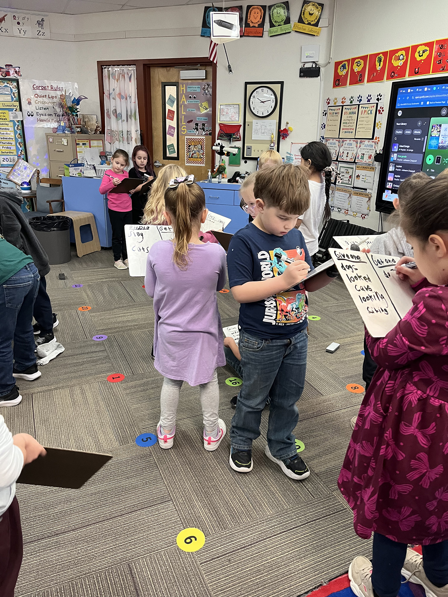 Julieann Chappell’s students reviewed suffixes last week using the Tribes strategies Milling to Music and Give One, Get One. These interactive activities allowed students to move around, share ideas, and practice together in an engaging way. The lesson combined teamwork with learning, making the review both fun and memorable for the class.