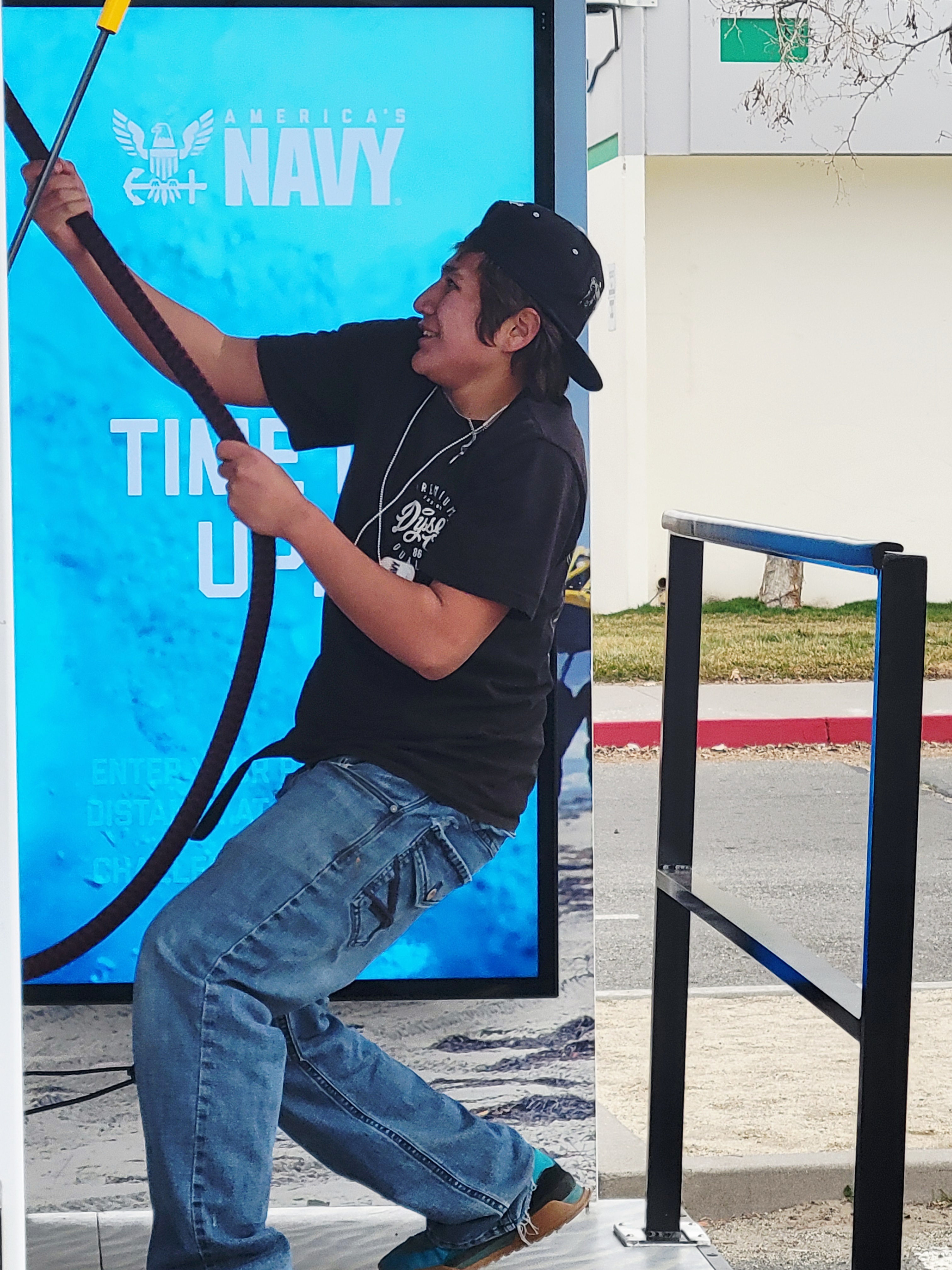 Superintendent Derild Parsons was on hand to witness the “Strike Group” and said, “This event is awesome, especially for a military-enriched community like Fallon, Nevada. Not every student comes to school for regular classroom subjects. They come for real-life experiences that offer an alternative career pathway besides college.” Photo below: Dacoma Miner takes on the Train Challenge multiple times, testing his Navy SEAL mettle. Staff Photos.