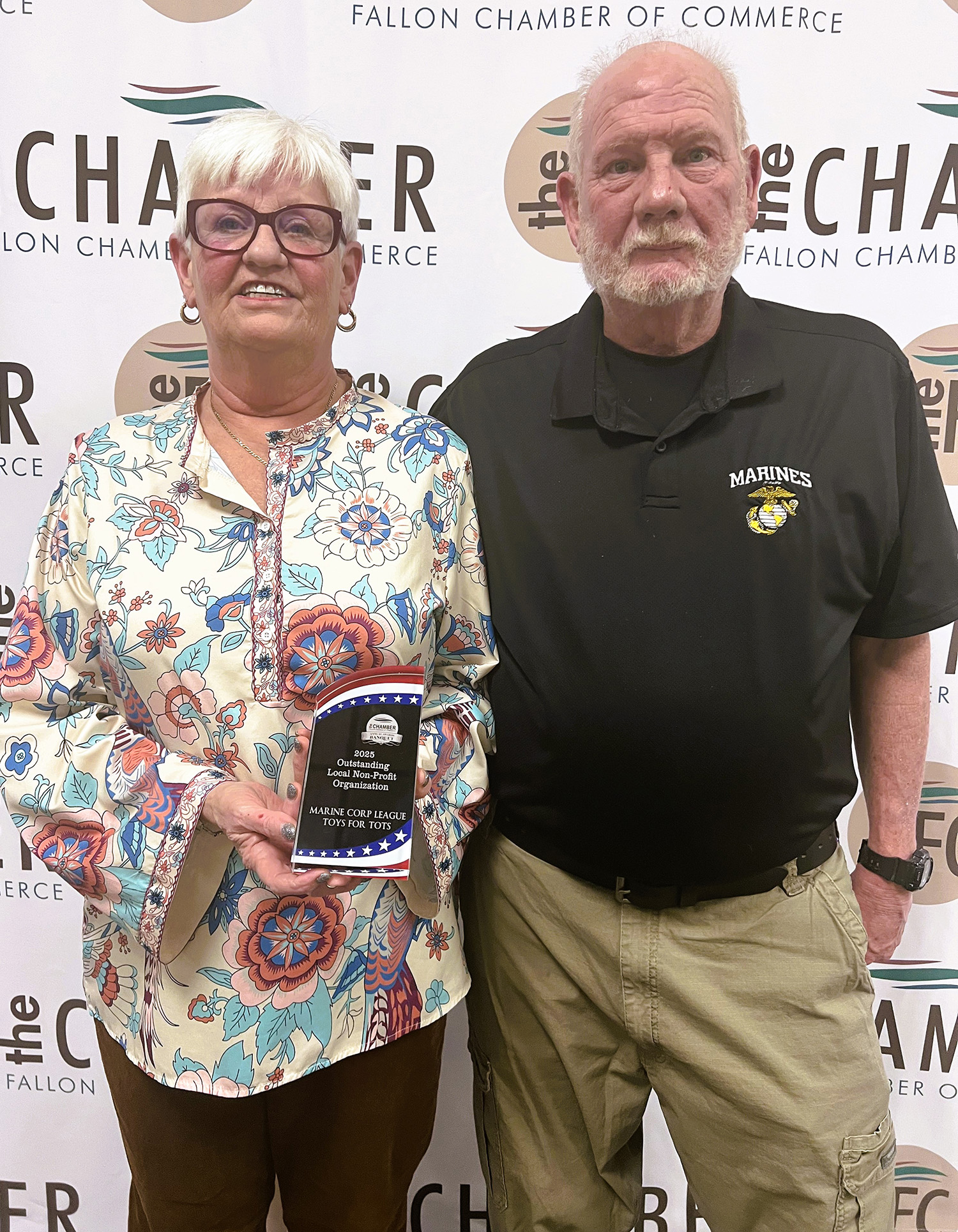 Outstanding Health and/or Beauty Services Business: Nominations went to PAM Specialty Hospital, Banner Churchill Community Hospital, and Skin Cancer & Dermatology, with the award going to Banner Churchill Community Hospital.. ![]() | Outstanding Home-based Business: Nominations went to Tipsy Tumbleweed Mobile Bar, Squish’s Pressure Washing, and Patriot Junk Removal, with the award going to Patriot Junk Removal. ![]() | Outstanding Local Non-Profit Organization: Nominations went to Domestic Violence Intervention, Marine Corps League/Toys for Tots, and Rotary Club of Fallon, with the award going to Marine Corps League/Toys for Tots. Libby and Gregory Harter. ![]() |