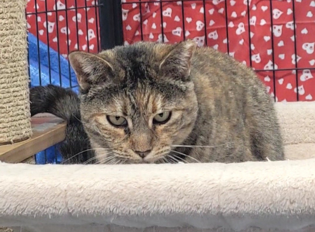 Ruby, a striking tortoiseshell tabby, is seeking a forever home after making an impressive transformation from her days as a feral cat. Once wary of humans, Ruby has embraced the comforts of indoor life, finding joy in gentle pets, tasty treats, and the warmth of a sunbeam.