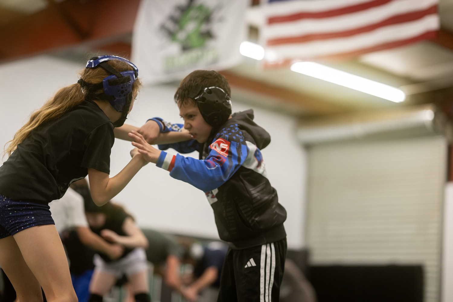 Pictured above left: Daxton Ritchie faces a challenging moment in practice as Coach Jordan Mize motivates him to keep fighting, a glimpse of the confidence and determination Greenwave athletes develop every day on the mat.