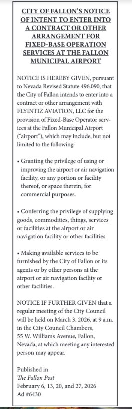 CITY OF FALLON NOTICE OF INTENT - FEBRUARY 6, 2026