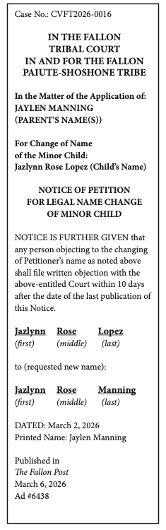 LEGAL NOTICE -IN THE FALLON TRIBAL COURT IN AND FOR THE FALL...