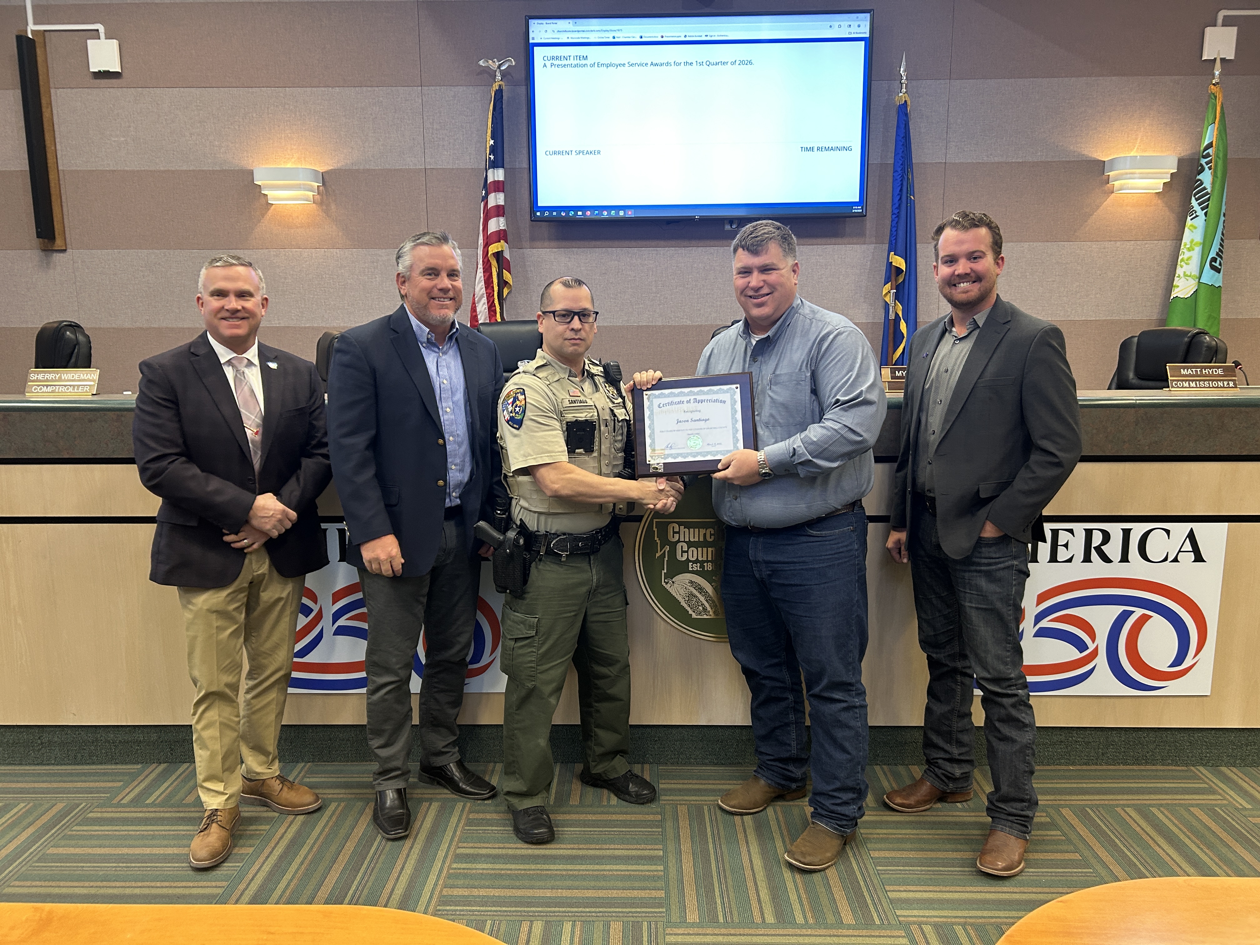 Below right: Commissioners Eric Blakey and Matt Hyde, Deputy Jason Santiago, Sheriff Richard Hickox, and Commissioner Myles Getto.
